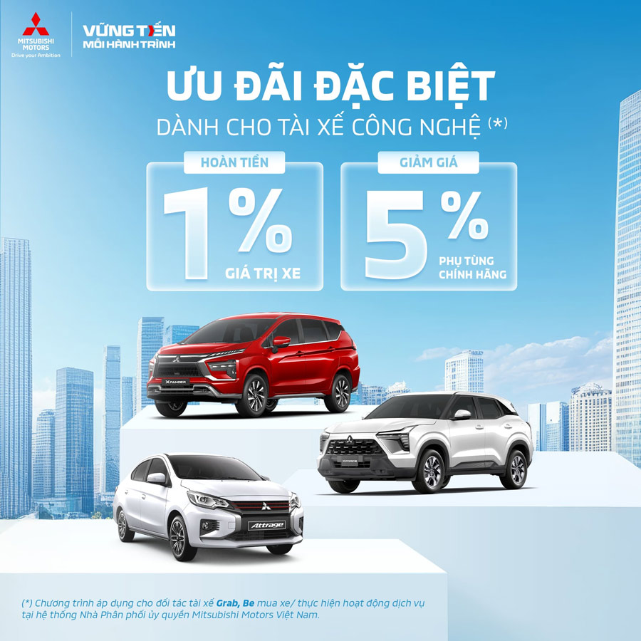 Theo chương trình đặc biệt này, các đối tác tài xế của Grab và Be sẽ được hưởng mức giảm giá trực tiếp một phần trăm (1%) trên giá bán lẻ đề xuất. Đây là cơ hội vàng để các tài xế sở hữu những mẫu xe Mitsubishi nổi tiếng về độ bền bỉ, khả năng tiết kiệm nhiên liệu vượt trội cùng chi phí vận hành hợp lý, tối ưu hóa hiệu quả kinh doanh.