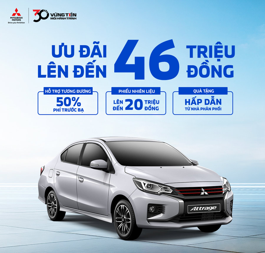 Attrage sản xuất năm 2024 mang đến ưu đãi tương đương 50% lệ phí trước bạ dành cho phiên bản CVT Premium và CVT, kèm theo phiếu nhiên liệu trị giá lên đến 20 triệu đồng. Ngoài ra, khách hàng còn được tặng 01 camera lùi hoặc phụ kiện tùy chọn theo phiên bản, tạo nên trải nghiệm lái xe hoàn hảo và tiết kiệm chi phí.