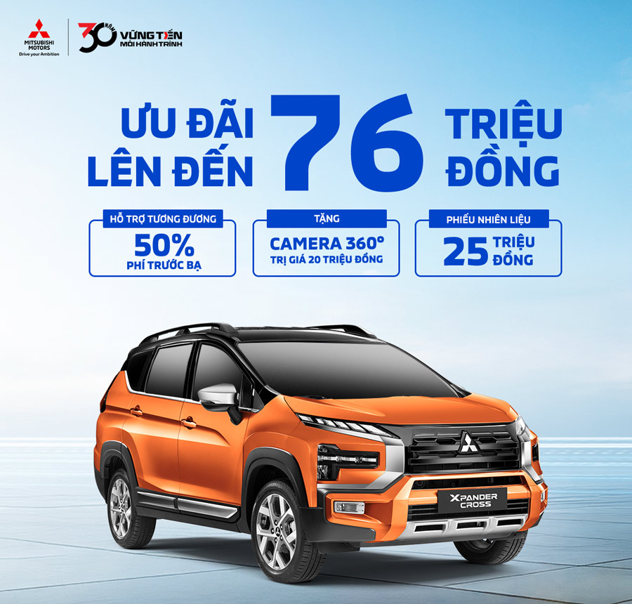 Khách hàng mua Xpander và Xpander Cross sản xuất năm 2024 sẽ được hưởng ưu đãi tương đương 50% lệ phí trước bạ, phiếu nhiên liệu trị giá lên đến 21 triệu đồng, cùng với 01 camera toàn cảnh 360 hoặc 01 camera lùi tùy theo phiên bản.